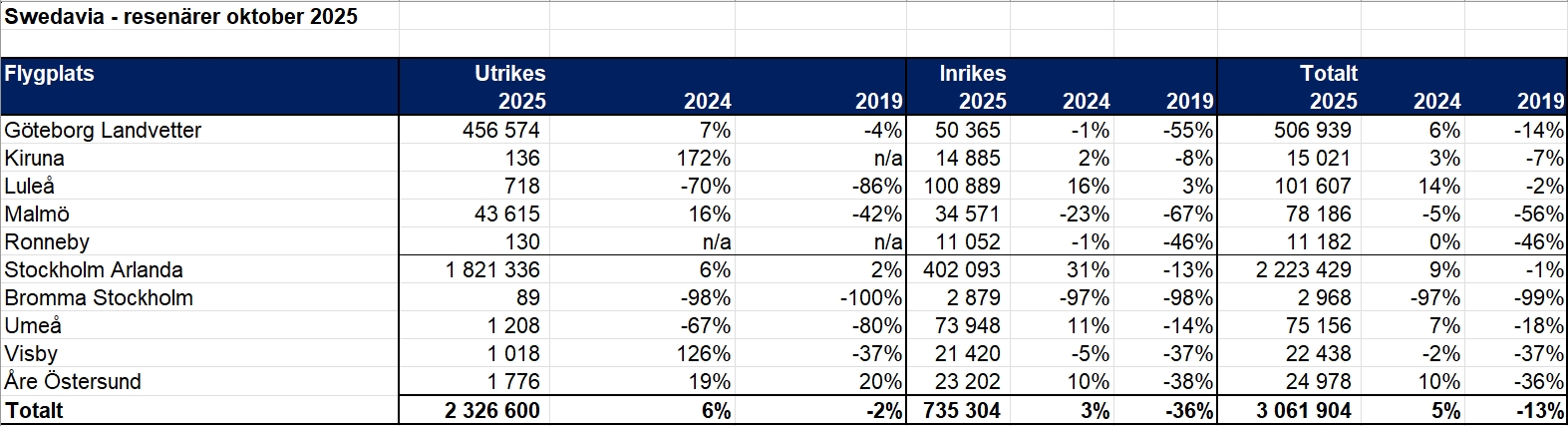 Swedavias trafikstatistik för oktober 2025: Stark utveckling för både utrikes och inrikes