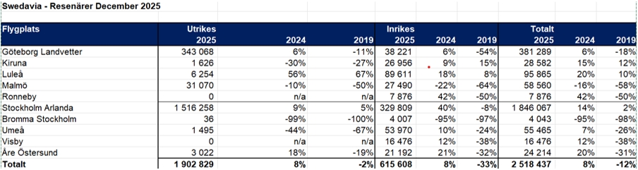 Under december månad reste drygt 2,5 miljoner resenärer via Swedavias tio flygplatser. Det är en ökning med åtta procent jämfört med december 2024. Både utrikes- och inrikesresandet ökade med åtta procent vardera under december. Samtliga flygplatser, med undantag för Bromma och Malmö, hade en stark efterfrågan på inrikesresor jämfört med december 2024.