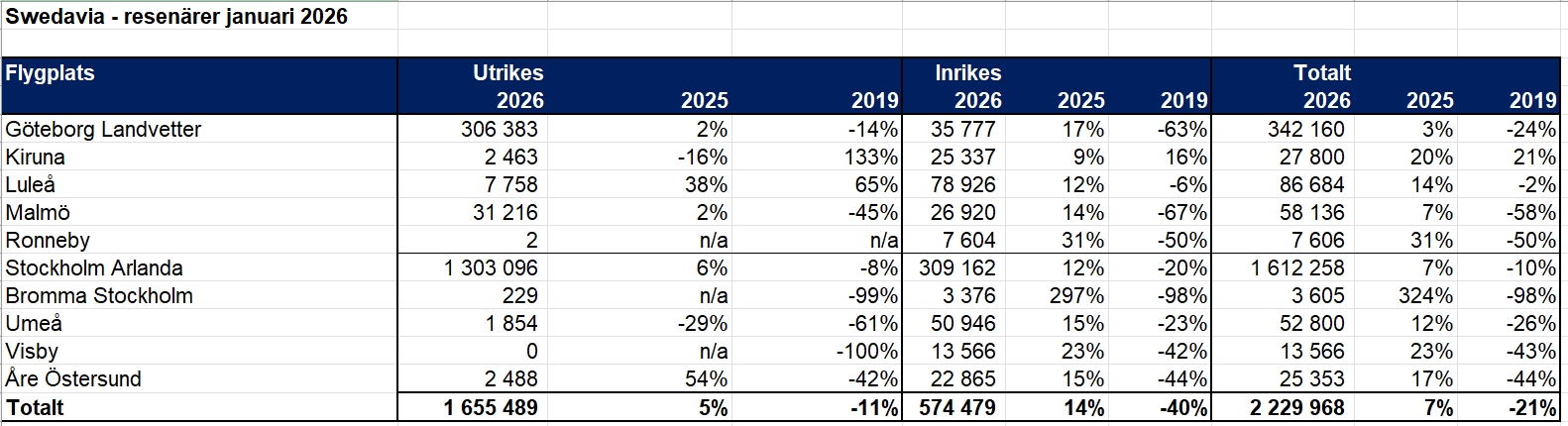 Swedavias övriga åtta flygplatser uppvisade en positiv utveckling med lokala skillnader under januari. Bortsett från Bromma Stockholm Airport hade Ronneby Airport, Kiruna Airport och Visby Airport de största procentuella ökningarna under månaden. För andra månaden i rad hade Kiruna Airport resenärsrekord för en enskild månad. Jämfört med prepandeminivåerna ökade den totala trafiken med 21 procent i januari 2026.